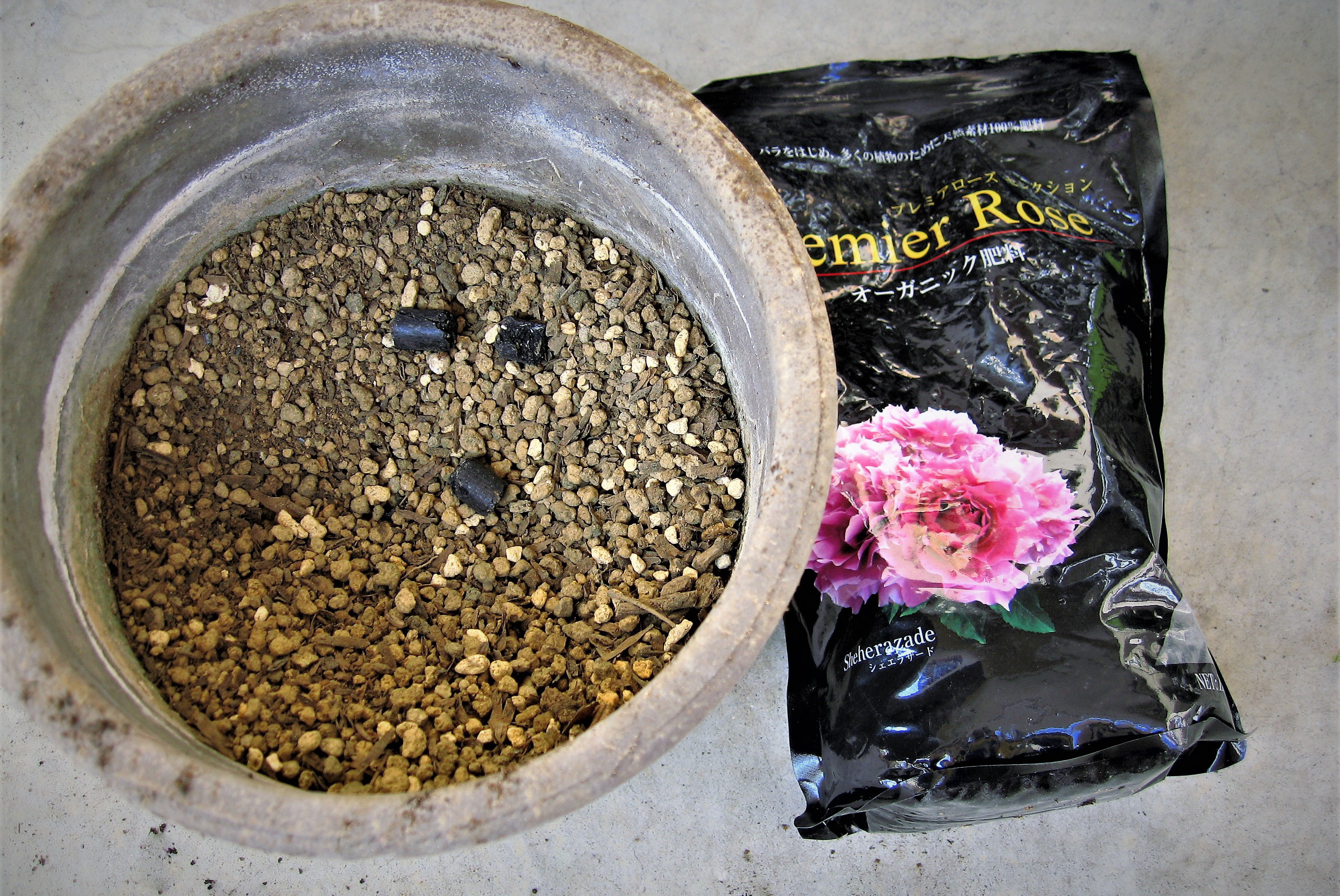 土の調達は、薔薇専用の土を通販で購入し、宅配便で玄関先まで届けてもらうサービスを利用し、前年暮くらいから準備しておく。