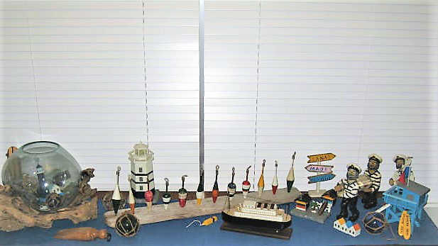 大好きなロイヤルブルーのリネンのテーブルランナーで海感を出し、流木をベースにしたガラスの花入れに小さな灯台を沈め海の底をイメージし、浮きをカラフルにペイントしたオブジェや客船、ビーチハウス・レスキューの見張り台・ちょっとほろ酔い気分の海のおじさんたちなど、気ままに並べていくと不思議と海の匂いがしてくる・・・なんだか波の音まで聞こえてくるような・・・