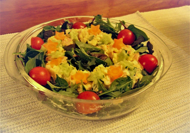 鶏の丸焼きやロースト・ビーフは素材を生かしてシンプルにいただくのが我が家流で、ポテトサラダはケーキの型を利用して星形の人参やキュウリを添えるだけで、白いリースに変身してしまう。