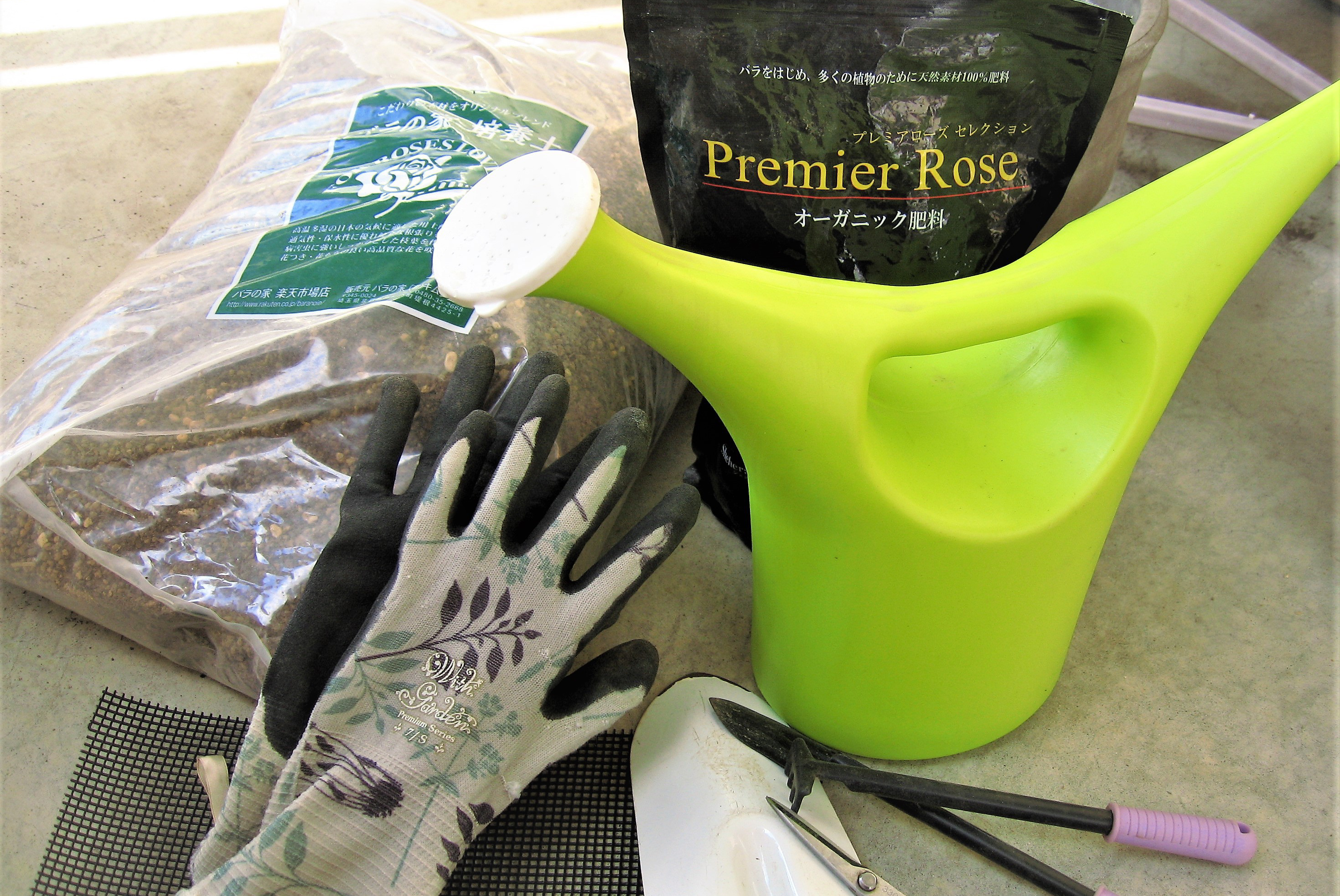 用意するのは、剪定ばさみ・スコップ類・薔薇専用の土・肥料・ジョウロ・園芸用手袋・バケツ・枯入袋など