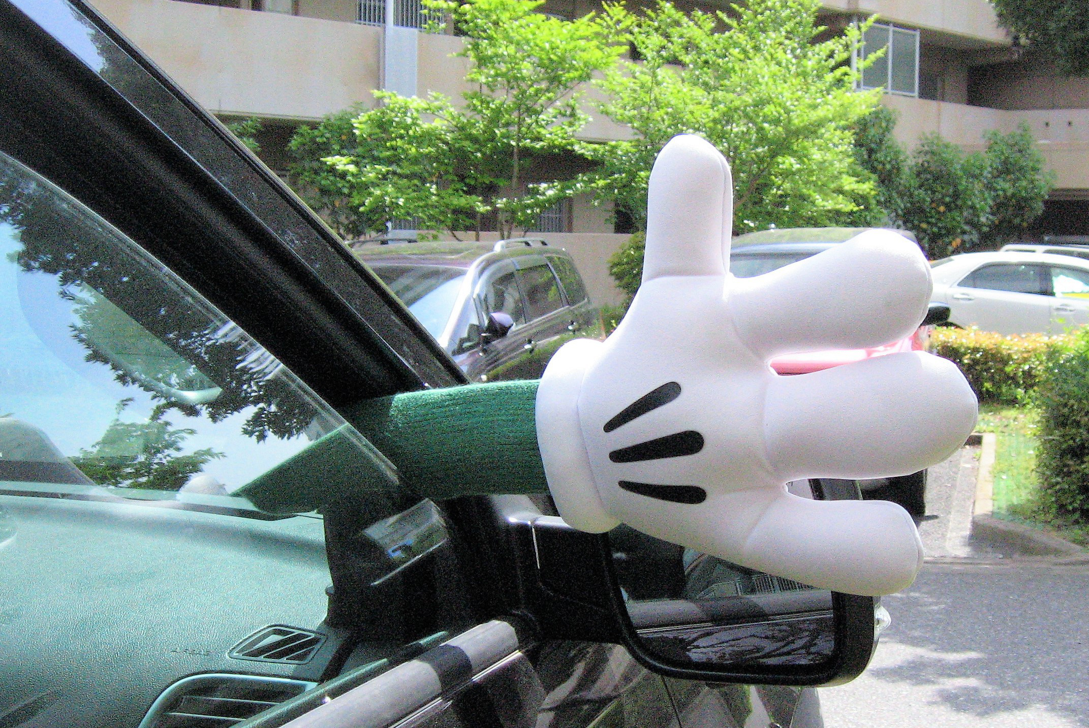 渋滞しているときなどの合流時、このミッキーの手を手袋にして窓から相手に見えるように振りながら会釈すると、たいてい笑って道を開けてくれるのである・・・これぞ、「ミッキー効果」といえるだろう!ユーモアを感じてくれるのか、世界中誰もが知っている世紀の大スターミッキーのお陰なのか・・でも誰も不愉快にはならない、とても有効な方法なので、試してみる価値と効果は充分にあると