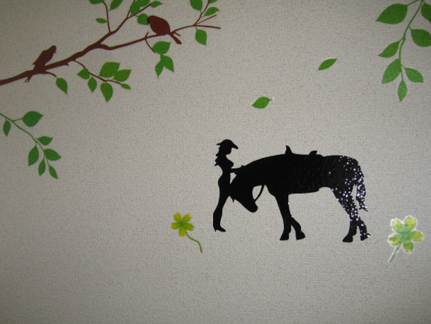 そうだ、あの個室、壁が白くて少し殺風景だし、ごくごく限られた人間しか利用しないし・・・ついでに、さわやかな感じでちょっと可愛い女の子と馬も、なんて、結局4パターンをオーダー、届いてからが大変、半日かけて子供の工作の時間のように、ペタペタと思い描く風景を目指して・・・なんと、サイドには大胆に壁一面草原を駆け抜けて行く青鹿毛・・・・手洗いの上部には枝先の小鳥の声も聞こえてきそうな木陰で遊ぶ少女と馬のイメージを・・・結構気に入って、ひとり悦に入っております・・・我が家のトイレ・・・