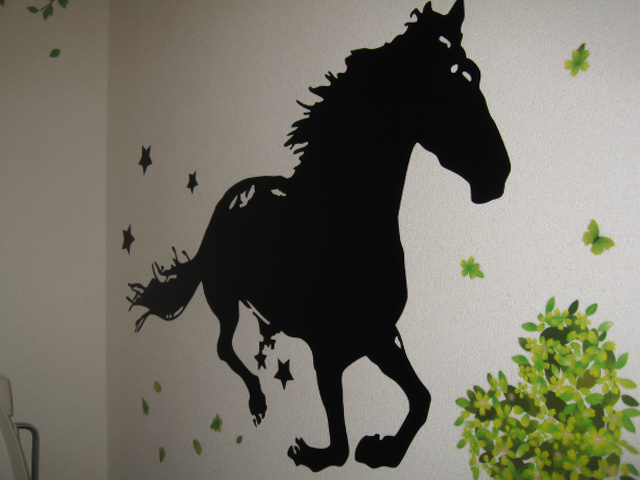しかも、大好きな馬をメインにと、ネットで検索をはじめたら有りました、大きな大きな(T80×W100 cm)シール! さて、どこにレイアウトしよう・・・?