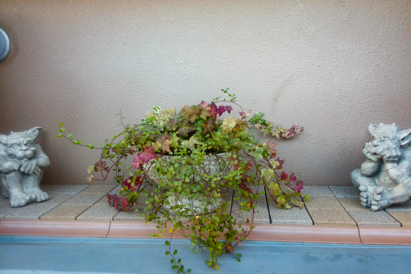 市販されているタイルを敷き詰めるだけの作業に加えて、イギリスのガーディナーの間では、守り神とされている小さな、でも愛嬌のある「ガーゴイル」2体を 寄せ植えを見守るように配しただけで、なんともいえない雰囲気が出てきたではありませんか?